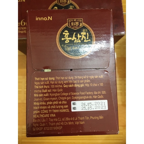 Sản phẩm NƯỚC HỒNG SÂM HONGSAMJIN GOLD được ứng dụng công nghệ sáng chế độc quyền, giữ trọn dưỡng chất quý giá từ Hồng Sâm Hàn Quốc 6 năm tuổi. Kết hợp cùng các chiết xuất Thảo Dược cao cấp gồm Gạc Hươu, Táo Tàu, Nấm Linh Chi, Quế. HONGSAMJIN GOLD mang đến giá trị dinh dưỡng tuyệt vời thông qua hương vị thơm ngon trong dạng chai uống liền tiện lơi. Thông tin khác Thực phẩm bảo vệ sức khỏe: NƯỚC HỒNG SÂM HONGSAMJIN GOLD Thành phần: Nước tinh khiết 79.427%, đường hóa lỏng 9.6%, fructo-oligosaccharide 7.8%, chiết xuất táo tàu 1.6%, màu caramel 0.5%, chiết xuất Hồng sâm 0.3%, Taurine 0.3%, chiết xuất nho tàu 0.12%, chiết xuất quế 0.12%, hương vị thực phẩm (hỗn hợp thảo dược và nhân sâm) 0.11%, citric acid 0.06%, chiết xuất gừng khô 0.05%, chiết xuất nấm linh chi 0.01%, chiết xuất gạc hươu 0.003%. Công dụng: – Hỗ trợ nâng cao sức khỏe, giảm mệt mỏi. Đối tượng sử dụng: Trẻ em trên 3 tuổi và người lớn. Lưu ý khi sử dụng: – Không sử dụng cho những người có mẫn cảm với bất kỳ thành phần nào của sản phẩm. Hướng dẫn sử dụng: – Ngày uống 1 chai. Dùng uống trực tiếp, ngon hơn khi uống lạnh. Chú ý: Thực phẩm này không phải là thuốc và không có tác dụng thay thế thuốc chữa bệnh. Hướng dẫn bảo quản: Nơi khô, mát, tránh ánh nắng mặt trời. Thời hạn sử dụng: Thời hạn sử dụng: 24 tháng kể từ ngày sản xuất. Ngày sản xuất và Hạn sử dụng in trên bao bì sản phẩm. Thể tích thực: 100ml/chai. Hộp 10 chai. Xuất xứ: Hàn Quốc. Nhà sản xuất: Kyongbuk College of Science Food Factory; địa chỉ: 520, Jisan-ro, Gisan-myeon, Chilgok- gun, Gyeongsangbuk-do, Hàn Quốc. Nhập khẩu, phân phối và chịu trách nhiệm về chất lượng sản phẩm: CÔNG TY TNHH HANKOL HEALTHCARE VINA Địa chỉ: Lầu 7, tòa nhà CJ, 2bis-4-6 Lê Thánh Tôn, Phường Bến Nghé, Quận 1, Thành phố Hồ Chí Minh, Việt Nam. LƯU Ý: Sản phẩm này không phải là thuốc và không có tác dụng thay thế thuốc chữa bệnh