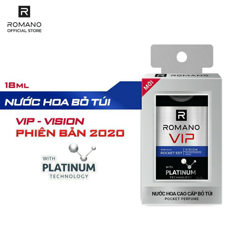 Nước hoa bỏ túi Romano nhanh chóng tiện lợi 18ml có thiết kế dạng chai mini bỏ túi tiện dụng, khả năng lưu hương lâu từ 4-6 tiếng Là biểu tượng đẳng cấp mới của người đàn ông hiện đại, Romano Vip Vision phiên bản đặc biệt sở hữu hương nước hoa độc đáo được chế tác từ