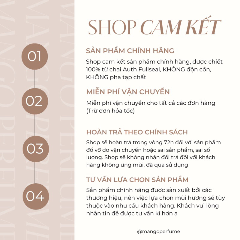 Hương đầu: Bergamot Hương giữa: Tiêu, Hoa Oải Hương, Đại Hồi, Nhục Đậu Khấu Hương cuối: Ambroxan, Vani ✅ Shop cam kết toàn bộ sản phẩm đều Chính Hãng, không pha tạp, độn cồn ✅ĐỀN BÙ x10 GIÁ TRỊ SẢN PHẨM VÀ TẶNG LUÔN SẢN PHẨM Khi nhận hàng các bạn phát hiện, cung cấp được bằng chứng sản phẩm này là hàng giả, hàng nhái, hàng kém chất lượng ✅ Đổi trả 1-1 nếu sản phẩm lỗi do vận chuyển hoặc từ NSX, đảm bảo sản phẩm đến tay khách là nguyên vẹn, mới nhất (Có video mở hàng liền mạch, không cắt ghép, chỉnh sửa để đảm bảo lợi ích) ✅ Mọi thắc mắc khách vui lòng nhắn qua Shopee Chat