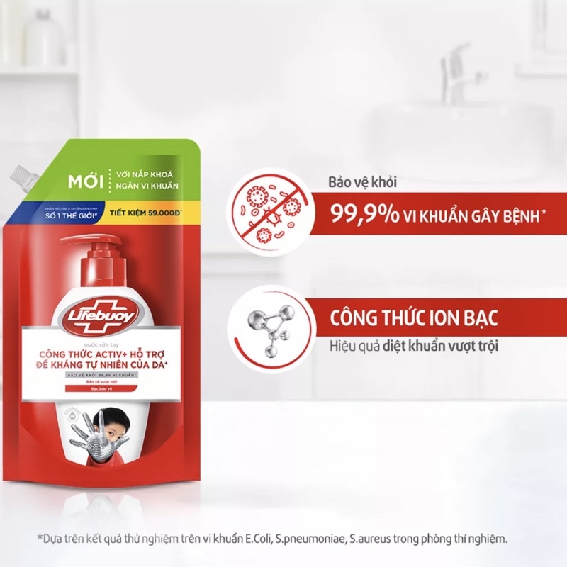 1/ Dòng sản phẩm Lifebuoy giúp bảo vệ khỏi 99.9% vi khuẩn Công thức chứa Ion Bạc+ hỗ trợ cùng đề kháng da tự nhiên Thành phần sạch khuẩn tiên tiến Active5 Activ+ giúp bảo vệ khỏi vi khuẩn NƯỚC RỬA TAY LIFEBUOY BẢO VỆ KHỎI VI KHUẨN 1KG (TÚI): BẢO VỆ VƯỢT TRỘI