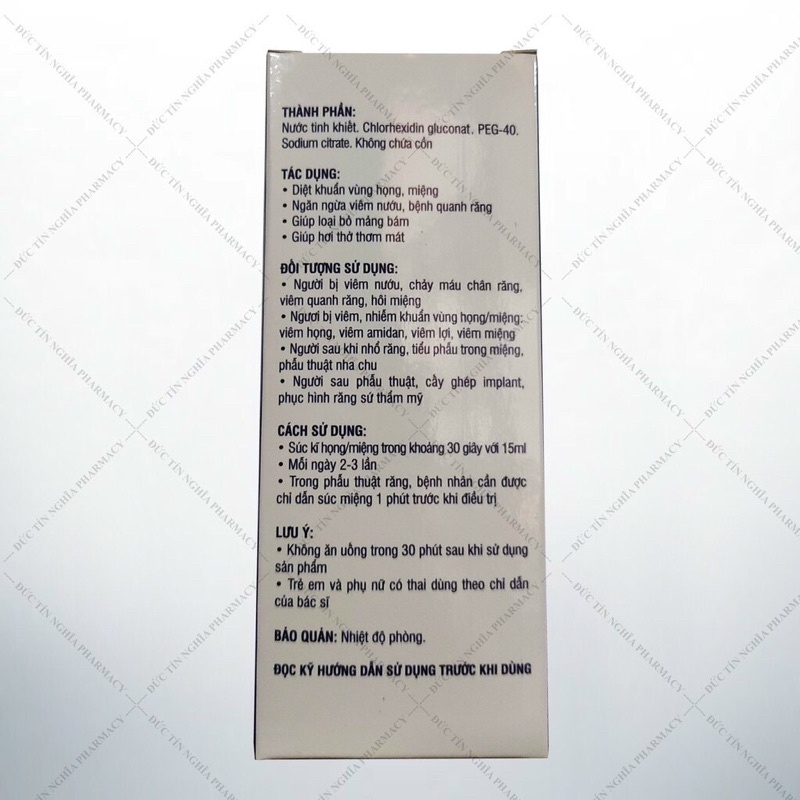 Nước Súc Miệng HMU Chlorhexidine 0.12% 🍀 Sản phẩm được Nghiên cứu & Phát triển bởi Đại Học Y Hà Nội - HMU một sản phẩm được tất cả bác sỹ nha khoa khuyên dùng. ---------- - Chlorhexidine: Hoạt chất có tính #sátkhuẩn phù hợp sử dụng trong #răngmiệng. - Nước súc miệng được sáng chế bởi Đại học Y Hà Nội, được đảm bảo chất lượng nên rất dễ tư vấn cho bệnh nhân. 🍀 THÀNH PHẦN CHÍNH - Chlorhexidine 0.12%: Hoạt chất có tính sát khuẩn phù hợp sử dụng trong răng miệng, sử dụng trong và sau phẫu thuật răng miệng. - 0.12% là nồng độ tối ưu đảm bảo tính sát khuẩn. Nếu nồng độ cao hơn , dễ gây đổi màu răng, diệt cả lợi khuẩn và gây loạn vị giác. 🍀 DẠNG BÀO CHẾ - Dung dịch nước súc miệng không chứa cồn nên đảm bảo hơi thở thơm mát (cồn sẽ gây khô miệng làm hơi thở hôi). - Đóng chai nhựa 250 ml, dễ dàng mang theo bên người ngay cả khi đi công tác, du lịch. - Hộp giấy bên ngoài ghi rõ Nghiên cứu và phát triển bởi Viện đào tạo Răng hàm mặt, Đại học Y Hà Nội (HMU). - Bên trong có màng seal, bên ngoài có tem chống hàng giả giữ cho sản phẩm luôn mới, bệnh nhân cảm giác mình là người duy nhất được bóc sản phẩm. 🍀 CHỈ ĐỊNH - Người bị viêm nướu, chảy máu chân răng, viêm quanh răng, hôi miệng. - Người bị viêm vùng khoang miệng. - Người sau khi nhổ răng, tiểu phẫu trong miệng, phẫu thuật nha chu. - Người sau phẫu thuật, cấy ghép implant, phục hình răng sứ thẩm mỹ. 🍀 CÁCH DÙNG - Súc miệng sau khi thực hiện các thủ thuật trên. - Ngày 2 lần - Súc miệng 10_15ml trong 30 giây.