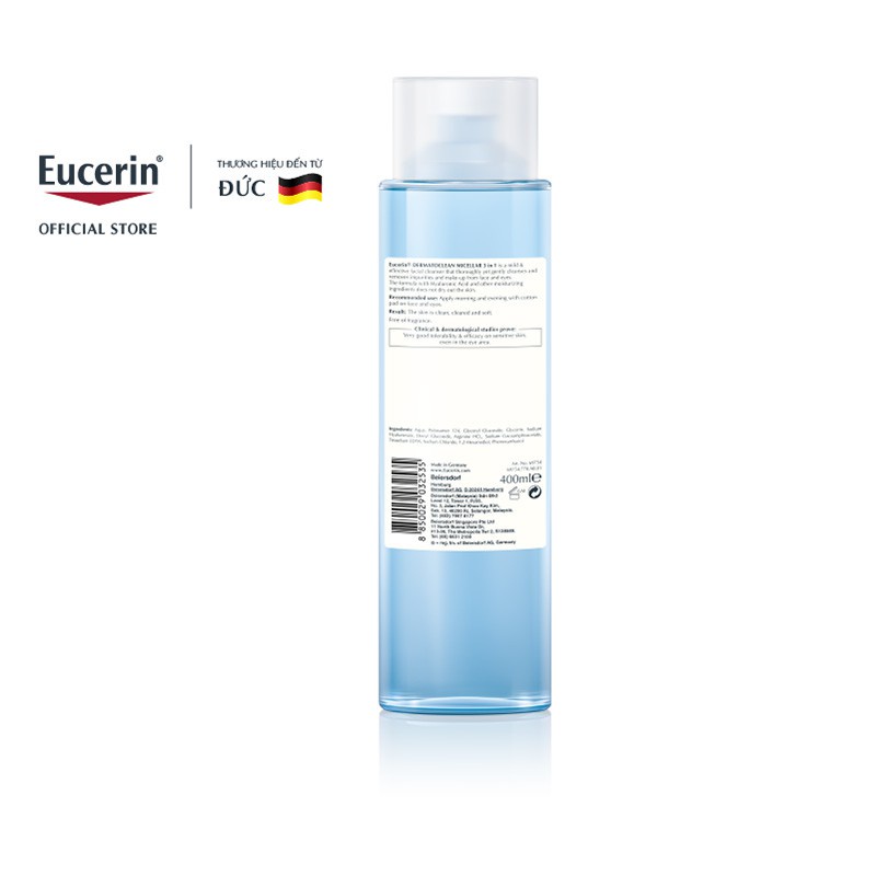 Nước Tẩy Trang Eucerin Dermatoclean Hyaluron 3In1 Dịu Nhẹ Cho Da Nhạy Cảm100ml-200ml-400ml Nước tẩy trang DermatoClean [HYALURON] Micellar 3 in 1 là giải pháp tối ưu mang đến một làn da sạch sẽ và tươi mới: - Tẩy sạch sâu tất cả lớp trang điểm trên da mặt, ngay cả mắt và môi. - Giúp da thông thoáng và hạn chế bít tắc lỗ chân lông. - Tiện dụng nhờ sự tích hợp đồng thời 3 công dụng: Tẩy trang, rửa mặt và cân bằng da. + Xuất xứ thương hiệu: Đức + Loại da phù hợp:Phù hợp mọi loại da, kể cả da nhạy cảm + Thuộc tính: - Không mùi - Không cồn + Thành phần: Aqua, Poloxamer 124, Glyceryl Glucoside, Glycerin, Sodium Hyaluronate, Decyl Glucoside, Arginine HCL, Sodium Cocoamphoacetate, Trisodium EDTA, Sodium Chloride, 1-2-Hexanediol, Phenoxyethanol Sản phẩm là sự kết hợp đột phá giữa các thành phần: - Phức hợp APG: Hợp chất làm sạch cực kì dịu nhẹ với bề mặt Glucoside có n guồn gốc tự nhiên. - Gluco-glycerol: Kích thích quá trình dưỡng ẩm tự nhiên của da. - Hyaluronic Acid: Cấp ẩm vượt trội. Nhờ vậy, các bước dưỡng tiếp theo sẽ được hấp thụ tốt nhất. Sản phẩm phù hợp cho mọi loại da, đồng thời cũng được chứng minh lâm sàng và da liễu phù hợp với làn da nhạy cảm, kể cả làn da quanh mắt và môi. + Công dụng: - Da thông thoáng hơn: Khả năng hấp thụ oxy của da được cải thiện đáng kể. - Tăng cường độ ẩm cho da: Da không chỉ sạch sâu và không khô đi mà còn được cấp ẩm sau khi tẩy trang. Nhờ đó, bạn có thể cảm nhận độ ẩm của da tăng lên sau 1 tuần thường xuyên sử dụng. - Kiểm nghiệm trên da nhạy cảm và da mắt: Được chứng minh thích hợp cho vùng da nhạy cảm, bao gồm cả vùng da xung quanh mắt. Đồng thời cũng được chứng minh an toàn cho mắt và những người có thói quen sử dụng kính áp tròng. + Hướng dẫn sử dụng: - Có thể sử dụng hàng ngày vào buổi sáng và tối - Thấm nước vào bông tẩy trang và nhẹ nhàng lau sạch vùng da quanh mắt, da mặt và cổ - Có thể làm lại cho đến khi miếng bông tẩy trang sạch - Tiếp tục các bước chăm sóc da hàng ngày + Thông tin dị ứng (nếu có): xem bảng thành phần. + Hướng dẫn bảo quản: Bảo quản nơi khô ráo, thoáng mát, tránh ánh nắng trực tiếp từ mặt trời. Để xa tầm tay trẻ em. + Ngày sản xuất/ Hạn sử dụng: Xem trên bao bì sản phẩm