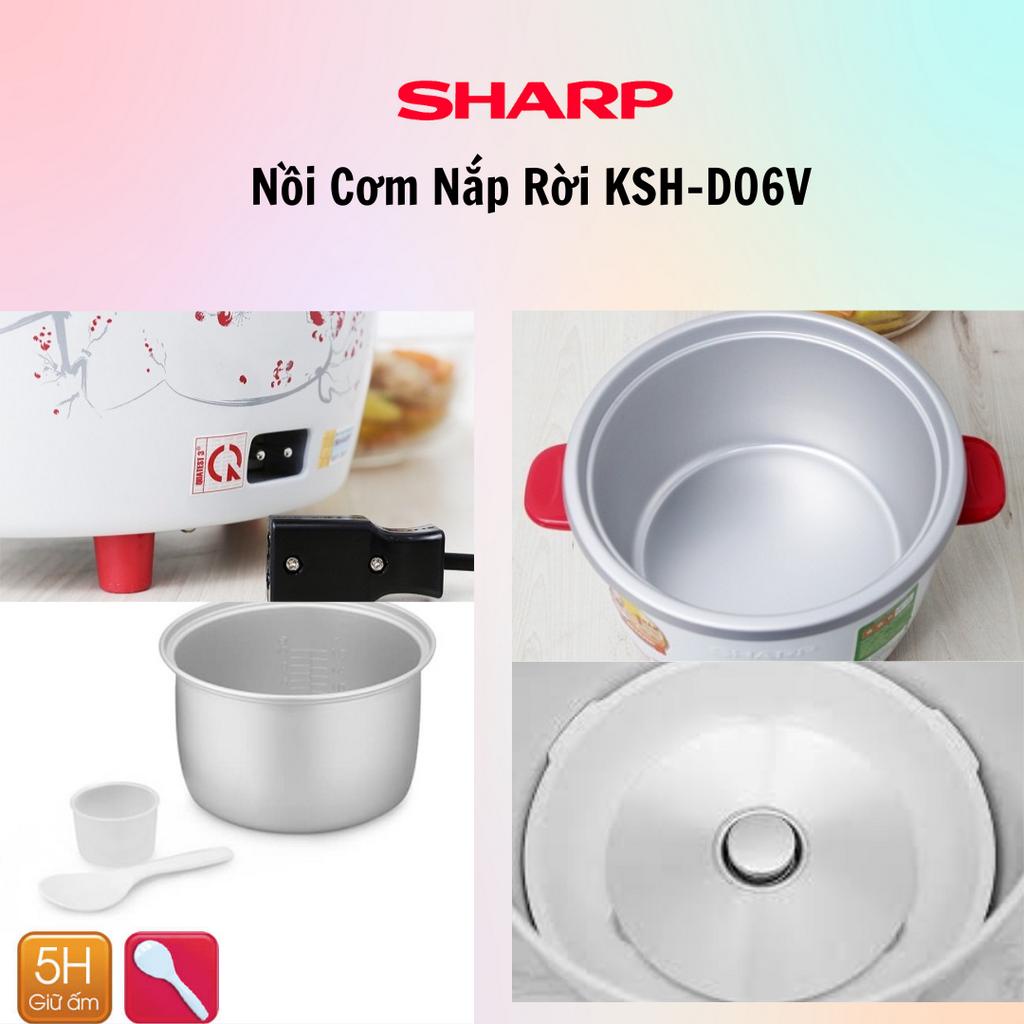 Mô Tả Sản Phẩm Công suất: 300W Dung tích: 0.6 lít Giữ ấm tối đa: 5 giờ Lồng nồi bằng nhôm cao cấp Có muỗng xới cơm đính kèm Dung tích 0.6L Nồi Cơm Điện Nắp Rời Sharp KSH-D06V có dung tích 0.6L, thiết kế nhỏ gọn và đơn giản thích hợp cho người độc thân hoặc gia đình ít