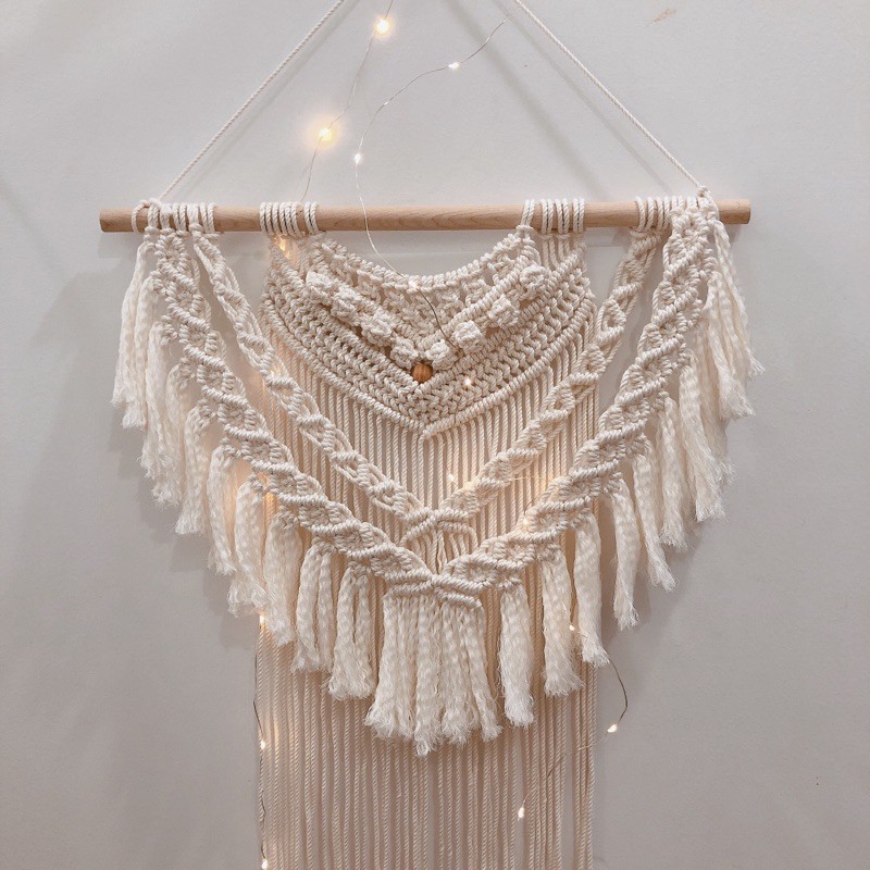 THÔNG TIN SẢN PHẨM -Mành macrame treo tường được tết thủ công vô cùng tỉ mỉ, dùng trang trí nội thất, treo trên đầu giường, treo trang trí trên diện tường....tạo điểm nhấn cho không gian thêm bắt mắt -Sản phẩm bao gồm : thanh gỗ tròn dài 50cm, dây đã tết macrame như h