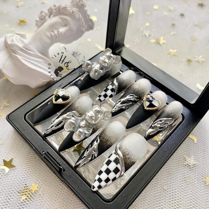 ĐÔI LỜI GIỚI THIỆU H&N Nailbox là một mảng của H&N NAILDESIGN của chúng mình. H&N Nailbox chuyên thiết kế Nailbox (móng giả) theo yêu cầu của khách hàng, bao gồm kích thước móng, form móng và mẫu mã mà khách hàng yêu cầu. Không như hàng trăm sản phẩm móng giả đang xuất hiện trên thị trường hiện nay (giá thành rẻ, nhưng chất lượng sản phẩm không như quảng cáo, và đa số là móng in sẵn bằng máy, không được đẹp), H&N Nailbox hướng đến sự tiện dụng, nhưng vô cùng chất lượng và tiết kiệm trong từng sản phẩm làm ra. 👉Ưu điểm của nailbox: - Tiết kiệm thời gian, rất tiện lợi, dễ sử dụng, quý khách không phải đợi hàng giờ đồng hồ ngoài tiệm. - Tất cả các mẫu Nail đềgu có thể làm Nailbox. - Khách hàng có thể tự cung cấp mẫu để bên mình làm theo mẫu. - Giá thành rẻ.b - Có thể tái sử dụng . 💅Nailbox bên mình còn đi kèm những phụ kiện sau: - 1 keo dán móng (độ bền 3-4 tuần) phụ thuộc vào cách bảo quản của khách, hạn chế đụng nước nhiều giờ đồng hồ. - 1 dũa móng - 1 que gỗ đẩy móng - 1 miếng dán silicon dùng tạm thời (độ bền 4-6 tiếng nếu ko đụng nước) - 1 miếng giấy cồn lau sạch móng trước khi dán. 🍭 Có thể tái sử dụng lại Nailbox được khi dùng miếng dán silicon đó ạ. Lưu ý: Vì H&N Nailbox thiết kế hoàn toàn THỦ CÔNG theo yêu cầu của khách hàng, vậy nên quý khách cần liên hệ trực tiếp với Shop để cung cấp số đo móng, form móng yêu cầu cũng như trao đổi thêm về yêu cầu thiết kế. Và có thể mất từ 1-2 ngày để bên mình hoàn thành sản phẩm. Thời gian đó sẽ không phí đâu nhé! Hình Ảnh Sản Phẩm 100% Shop tự chụp. Cam kết hoàn tiền 100% nếu Sản phẩm không đúng như mô tả hình ảnh. 🔥 Trong trường hợp khi khách hàng đặt hàng mà không chủ động nhắn tin cho shop để đo sz móng, shop sẽ chủ động nhắn tin hỏi số đo móng. trong vòng 24h khách không trả lời shop sẽ làm theo số đo phổ thông. Mong quý khách lưu ý. Xin cảm ơn ạ 😎