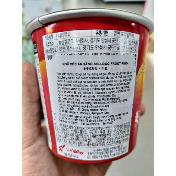 NGŨ CỐC ĂN SÁNG KELLOGG FROOT RING CỐC 30G - Xuất xứ: Hàn Quốc - Thương hiệu: Kellogg's - Quy cách đóng gói: cốc - Trọng lượng: 30G - Hạn Sử Dụng: 12 tháng kể từ ngày sản xuất - Hướng dẫn sử dụng: Ăn trực tiếp hoặc kèm với sữa - Hướng dẫn bảo quản: Bảo quản nơi khô ráo, tránh ánh nắng mặt trời trực tiếp - Thành phần: Bột ngô, đường,yến mạch, hỗn hợp yến mạch, bột gạo, bột mỳ, vitamin B2, B5, A, D, màu thực vật.... - Hương Vị: Yến mạch THÔNG TIN SẢN PHẨM: - Ngũ Cốc Ăn Sáng Kellogg Froot Ring cốc 30g Cung cấp năng lượng buổi sáng cho cơ thể. Hỗn hợp gồm các vitamin tốt cho sức khỏe phù hợp với mọi độ tuổi - Nguyên liệu sản xuất được đảm bảo chất lượng cao cấp, quy trình sản xuất khép kín đạt chuẩn an toàn thực phẩm - Sản phẩm được đóng cốc có thìa kèm theo rất tiện dụng, nắp đậy chắc chắn, thuận tiện mang theo và sử dụng - Ngũ Cốc Ăn Sáng Kellogg Froot Ring cốc 30g biến bữa sáng của bạn trở nên thật thơm ngon và bổ dưỡng với hỗn hợp ngũ cốc yến mạch và Froot Ring độc đáo. Màu sắc rực rỡ với hương vị thơm ngon đặc biệt thu hút các bé. Với tỉ lệ thành phần dinh dưỡng cao, được sản xuất từ những nguyên liệu được tuyển chọn kĩ càng, sản phẩm đảm bảo an toàn thực phẩm cho người sử dụng. - Ngũ cốc Kellogg với hương vị đặc trưng Hàn Quốc phù hợp với mọi thành viên trong gia đình. Sản phẩm có thể dùng cho bữa sáng hoặc bữa phụ trong ngày.