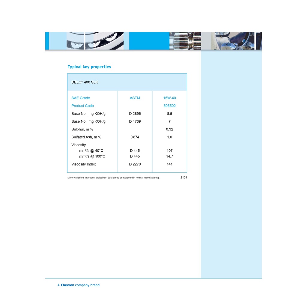 *CAM KẾT 100% HÀNG CHÍNH HÃNG ! *HÀNG DATE MỚI ( SẢN XUẤT TRONG NĂM ) ! Tên sản phẩm : Delo 400 SLK Sản xuất : Việt Nam Độ nhớt : 15w40 Định lượng : 5L, 18L * Sản phẩm đạt tiêu chuẩn : API CK-4, CJ-4, CI-4, CH-4/ SN, CI-4 Plus • Cummins CES 20086 • Detroit Fluids Specification (DFS) 93K222 • Renault RLD-3 • Volvo VDS-4.5 • Mack EOS 4.5 • DEUTZ DQC III-18 LA • ACEA E9 • Caterpillar ECF-3 • Daimler MB-Approval 228.31 • DEUTZ DQC III-10 LA • Ford WSS-M2C171-F1 • MAN M 3775 • MTU Category 2.1 Đặc tính sản phẩm : - Delo 400 SLK SAE 15W-40 với Công nghệ tiên tiến ISOSYN ADVANCED là dầu động cơ diesel 4T hạng nặng với công thức giúp hạn chế tối đa muội than “low-SAPS”, được thiết kế đặc biệt bằng cách sử dụng công nghệ phụ gia thế hệ mới nhất để bảo vệ vượt trội động cơ diesel tốc độ cao yêu cầu chất bôi trơn hiệu suất API CK-4, CJ-4, CI-4 PLUS / SN hoặc ACEA E9 hoạt động trong các điều kiện dịch vụ khắc nghiệt nhất. +Giảm chi phí bảo dưỡng >Khả năng phân tán muội và chống mài mòn ưu việt giúp bảo vệ xy-lanh, pít-tông, xéc-măng và kim phun nhiên liệu không bị mài mòn và ăn mòn, nhờ đó tăng tuổi thọ động cơ và giảm chi phí bảo dưỡng. Góp phần giúp xe tối đa hóa hiệu năng sử dụng và giảm thiểu thời gian dừng vận hành. +Bảo vệ tuyệt vời hệ thống xử lý khí xả >Được pha chế với công nghệ “Tro phụ gia thấp – Low SAPS” ( tro sun-phát + phốt-pho + lưu-huỳnh), giúp giảm hàm lượng các kim loại và phụ gia phốt-pho, lưu huỳnh sử dụng. Nhờ đó giúp tăng tuổi thọ của bộ xúc tác kim loại và bộ lọc hạt khí xả (DPF – Diesel Particulate Filter). +Giảm chi phí lưu kho >Tương thích với các động cơ đời trước yêu cầu dầu đạt cấp chất lượng API đời trước. Phù hợp sử dụng cho động cơ xăng 4 thì hút khí tự nhiện hoặc có tuốc-bô tăng áp và động cơ diesel tải nặng điều khiển điện tử / phát thải thấp yêu cầu nhớt động cơ tải nặng SAE 15W-40. ! Delo 400 SLK SAE 15W-40 được khuyến nghị cho dầu động cơ diesel hạng nặng “low-SAPS” trong đó cấp độ nhớt API CK-4, CJ-4, CI-4 PLUS / SN hoặc ACEA E9 và SAE 15W-40 được yêu cầu bởi các nhà sản xuất. Sản phẩm được pha chế cho các động cơ hoạt động trong môi trường khắc nghiệt và điều kiện khí hậu khác nhau.