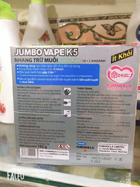 Nhang muỗi Jumbo Vape Hương Hoa Lài Hộp 10 Khoanh Công nghệ diệt trừ muỗi đến từ Nhật Bản Bảo vệ gia đình bạn khỏi muỗi vằn truyền bệnh sốt xuất huyết. Hạ gục muỗi ngay phút đầu tiên. Hương Hoa Lài, mang lại cảm giác dễ chịu cho cả gia đình. Công thức hoàn toàn mới, ít khói •• Hiệu quả hơn gấp 2 lần Hướng dẫn sử dụng: 1. Nhẹ nhàng tách khoanh Jumbo kép thành 2 khoanh nhang đơn từ trung tâm bằng đầu ngón tay. 2. Gắn khoanh nhang đơn vào giá và đốt đầu ngoài khoanh nhang, sau đó thổi tắt lửa.