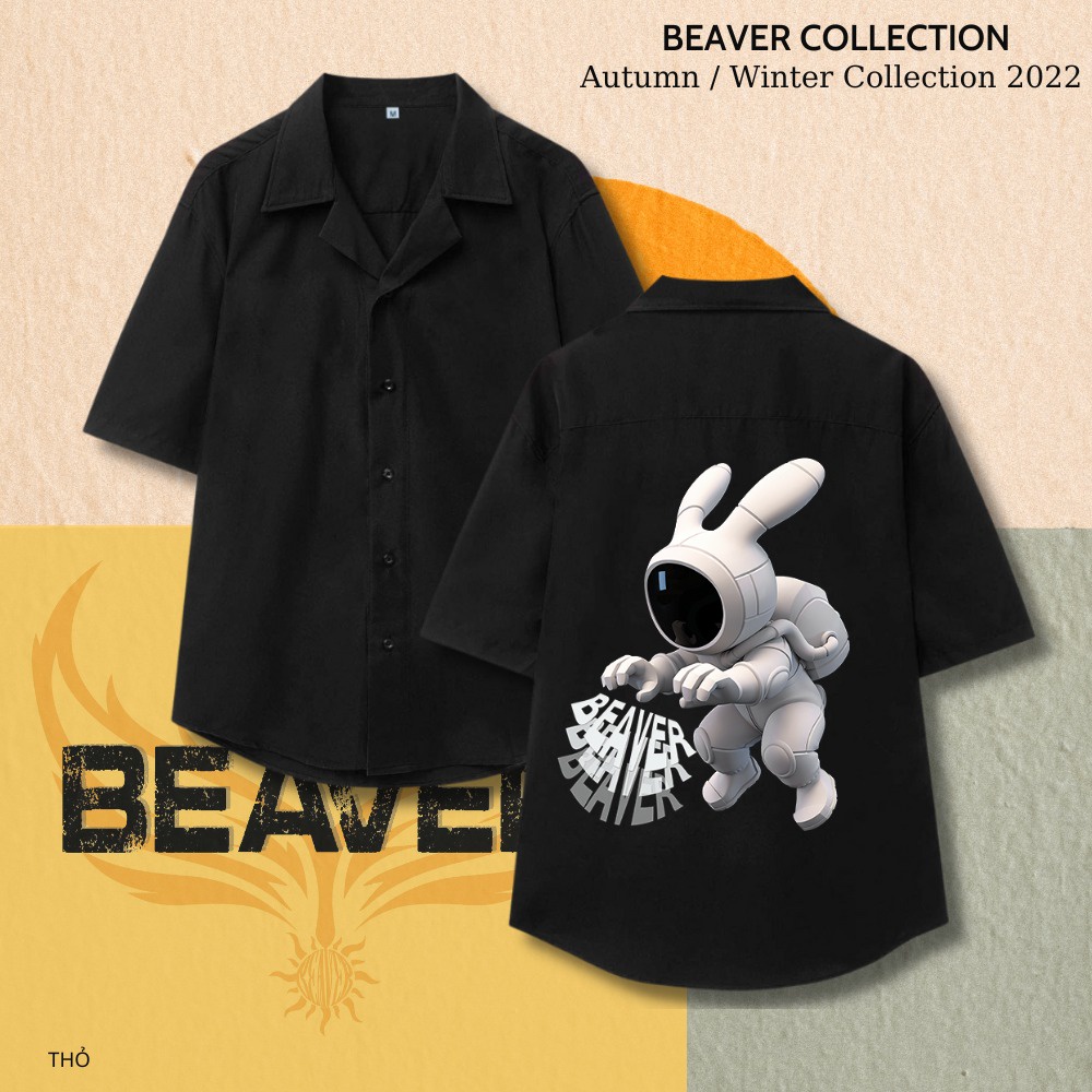 NHIỀU MẪU Áo Sơ Mi ĐEN Hoạ Tiết BEAVER Tay Ngắn Cổ Vest Thời Trang Unisex Vải Lụa Chéo