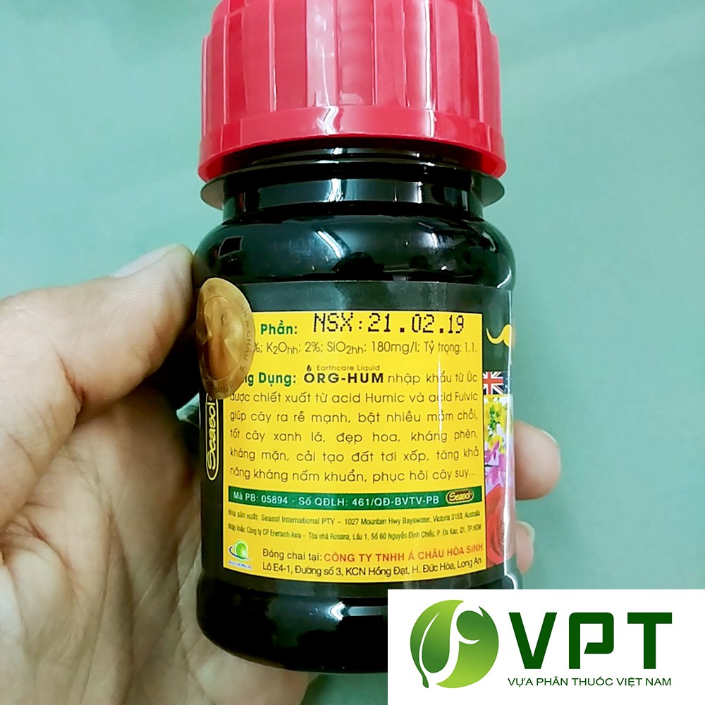Là sản phẩm được khuyên dùng thay thế Humic Acid 322 để kích rễ cho cây trồng cực tốt Nguyên liệu được nhập khẩu từ Úc Thành phần: Ngoài Humic Acid và Fulvic Acid, Org Hum còn có chứa nhiều nguyên tố vi lượng, hàm lượng Kali khá cao nên cho hiệu quả và lợi ích vượt trội so với Humic 322 lúc trước và Humic 14% sau này. Công dụng của Org Hum: - Cải tạo đất tươi xốp, phát triển bộ rễ khỏe mạnh - Phục hồi cây suy, trẻ hóa cây lâu năm - Tăng diệp lục tố, làm cây lá xanh tươi - Giúp cây hấp thu dinh dưỡng và vận chuyển khoáng vi lượng vào cây nhanh hơn, tốt hơn - Làm giảm nnhu cầu nước của cây trong mùa khô - Làm giảm mặn, hạ phèn trong mùa mưa - Năng suất, chất lượng và giá thành tăng cao - Kết hợp với Super Thrive và Dekamon thành bộ ba kích rễ cực tốt cho nhiều loại cây trồng, đặc biệt là phong lan Cách dung: - Liều phun qua lá cho nhiều loại cây trồng: 30ml/16 lít nươc (7-10 ngày phun 1 lần) (Cây lương thực, cây ăn trái, cây có múi, cây công nghiệp, rau màu, hoa cảnh, phong lan...) - Pha kết hợp liều tưới gốc: 40ml/20 lít - Nên trộn với đât trước khi xuống giống - Kết hợp cả phun và tưới gốc trong quá trình chăm sóc