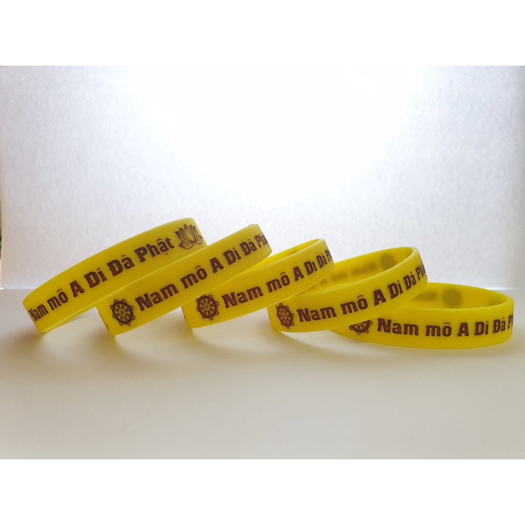 Pamnemyam xin giới thiệu các Qúy bạn sen Vòng tay cao su A Di Đà Phật ạ😊 ✨✨Giá yêu thương✨✨ 🔺Size : 180x12x2mm 🔺Màu sắc: như ảnh sản phẩm, GIAO NGẪU NHIÊN Ạ, nếu quý bạn muốn màu nào vui lòng ib shop ạ, nếu còn shop sẽ gửi cho bạn nhé! 🔺Quy cách: Dập chìm đổ màu logo