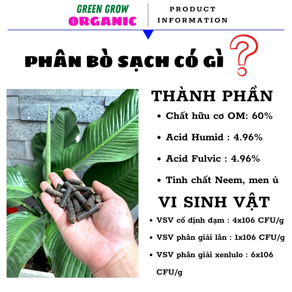 Phân bò hoai đã xử lý túi 1kg Green Grow Organic dạng viên khoáng, phân bón hữu cơ trồng rau sạch, hạt giống, xơ dừa - Thành phần: Phân bò 100% nguyên chất, được xử lý mầm bệnh gây hại. Qua quy trình đóng viên tiên tiến - Phân bò sạch được đánh giá là mang lại nhiều