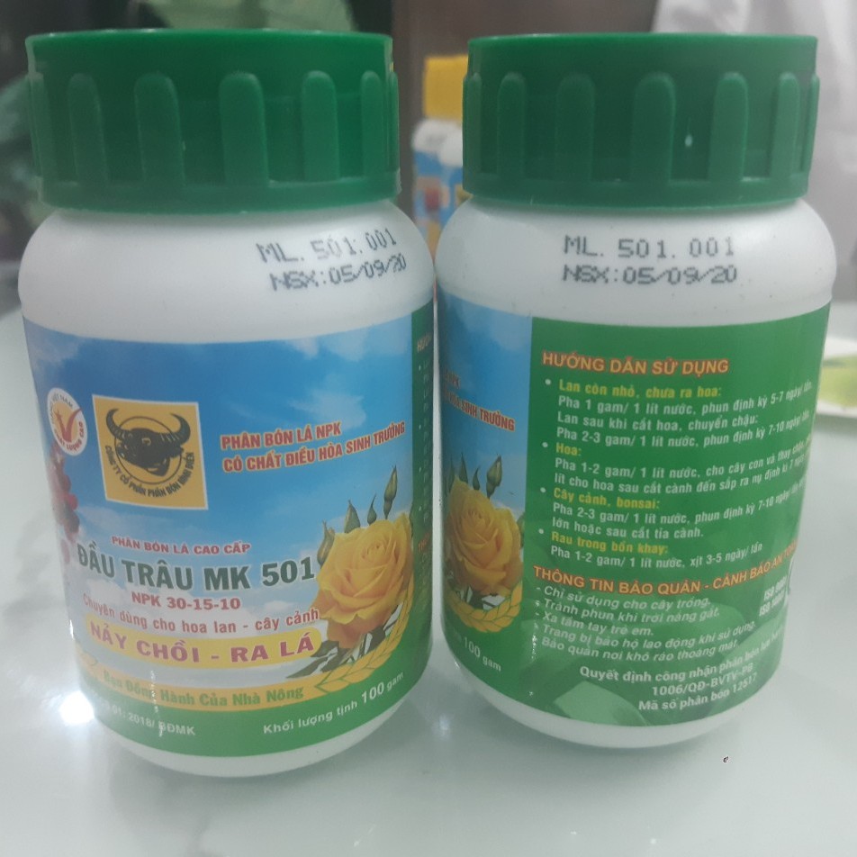 Phân bón lá đầu trâu 501 nảy chồi ra lá chất lượng cao 100g Đầu trâu 501 (ra nhiều chồi mới, thân lá phát mạnh) Trọng lượng: 100g Thành phần: 30% đạm (N), 15% lân (P2O5), 10% kali (K2O), 0,05% magiê (Mg), 0,05% canxi (Ca), 0,01% bo (B), 0,05% kẽm (Zn), 0,05% đồng (