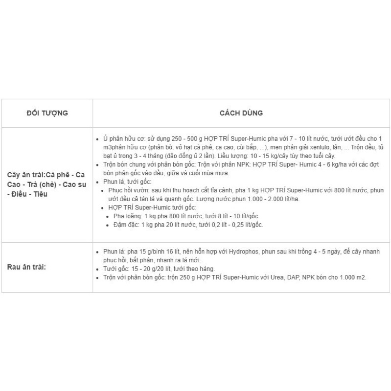QUY CÁCH: Gói 250 gr THÀNH PHẦN: Acid Humic 70% (Độ ẩm: 20%) TÍNH NĂNG TÁC DỤNG HỢP TRÍ Super-Humic hoạt động như một kích thích tố sinh học tự nhiên. Khi phun lên cây sẽ tăng cường các hoạt động sinh tổng hợp trong cây; chống stress, giải độc phèn, ngộ độc hữu cơ; tăng sinh trưởng và năng suất do hấp thu dinh dưỡng thuận lợi hơn. HỢP TRÍ Super-Humic rải hay tưới vào đất có tác dụng: Kích thích hệ rễ phát triển Tăng khả năng hấp thu phân bón Tăng đề kháng Ít sâu bệnh hại Giảm thuốc BVTV Tăng năng suất và chất lượng nông sản. CÁCH DÙNG: Bón lót: 1 - 2 kg HỢP TRÍ Super-Humic + 200 - 300 kg lân + 25 - 30 kg Urê/ha trước khi gieo sạ hoặc cấy (sau khi gạn, chắt nước). Bón thúc đợt 1 (7 - 10NSS): 1 - 2 kg HỢP TRÍ Super-Humic + 50 kg Urê + 25 - 50 kg Kali/ha. Nếu trước đó không có bón lót thì thêm 30 kg DAP. Ủ phân hữu cơ: sử dụng 250 - 500 g HỢP TRÍ Super-Humic pha với 7 - 10 lít nước, tưới ướt đều cho 1 m3 phân hữu cơ (phân bò, vỏ hạt cà phê, ca cao, cùi bắp, ...), men phân giải xenlulo, lân, ... Trộn đều, tủ bạt ủ trong 3 - 4 tháng (đảo đống ủ 2 lần). Liều lượng: 10 - 15 kg/cây tùy theo tuổi cây. Trộn bón chung với phân bón gốc: Trộn với phân NPK: HỢP TRÍ Super- Humic 4 - 6 kg/ha với các đợt bón phân gốc vào đầu, giữa và cuối mùa mưa. Phun lá, tưới gốc:Phục hồi vườn: sau khi thu hoạch cắt tỉa cành, pha 1 kg HỢP TRÍ Super-Humic với 800 lít nước, phun ướt đều cả tán lá và quanh gốc. Lượng nước phun 1.000 - 2.000 lít/ha. HỢP TRÍ Super-Humic tưới gốc:Pha loãng: 1 kg pha 800 lít nước, tưới 8 lít - 10 lít/gốc. Đậm đặc: 1 kg pha 20 lít nước, tưới 0,2 lít - 0,25 lít/gốc. Phun lá: pha 15 g/bình 16 lít, nên hỗn hợp với Hydrophos, phun sau khi trồng 4 - 5 ngày, để cây nhanh phục hồi, bắt phân, nhanh ra lá mới. Tưới gốc: 15 - 20 g/20 lít, tưới theo hàng. Trộn với phân bón gốc: trộn 250 g HỢP TRÍ Super-Humic với Urea, DAP, NPK bón cho 1.000 m2.