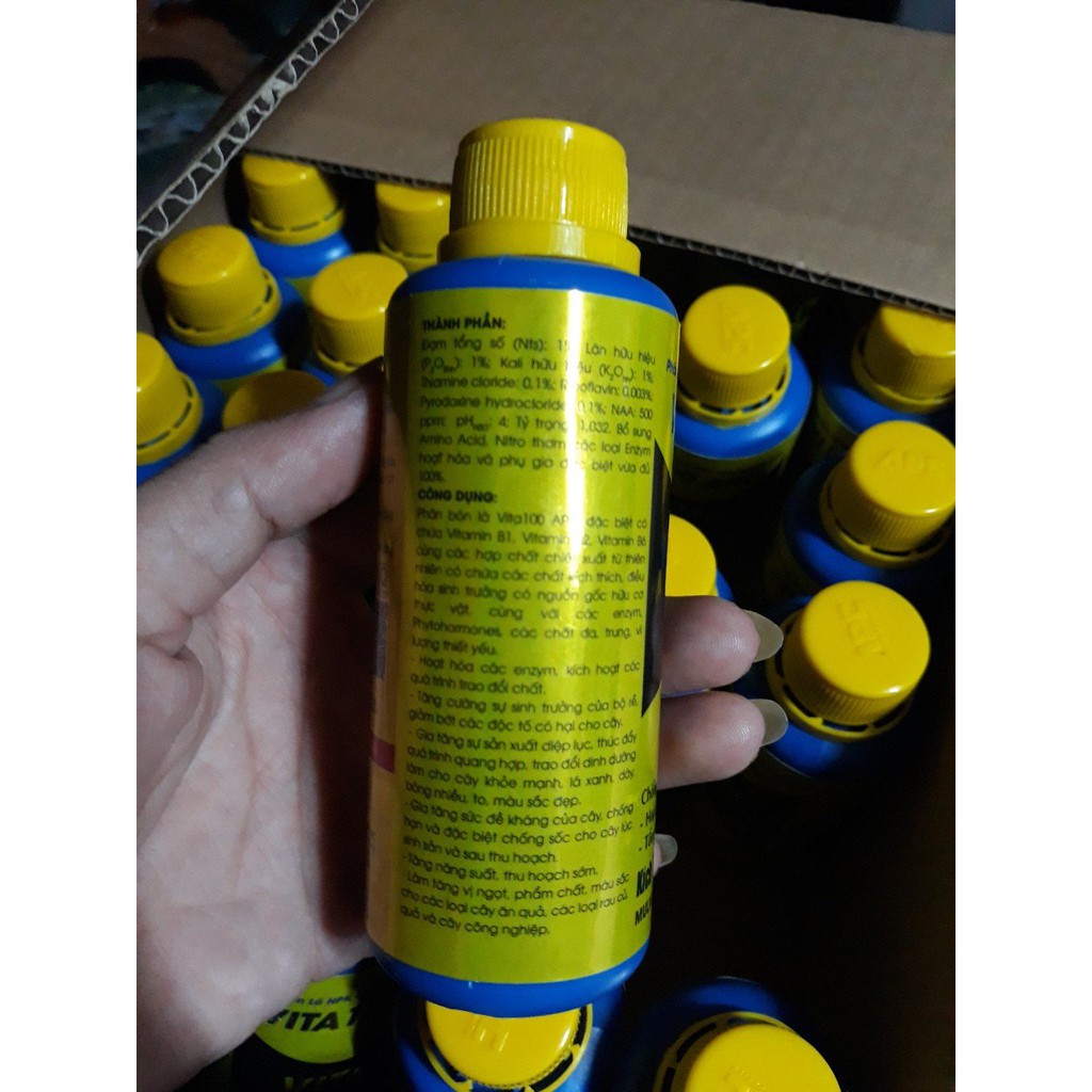 Phân Bón Lá Vitamin B1-B2-B6 VITA100 APC Chai 100ml đặc biệt có chứa Vitamin B1, Vitamin B2, Vitamin B6 cùng các hợp chất chiết xuất từ thiên nhiên có chứa các chất kích thích, điều hòa sinh trưởng có nguồn gốc hữu cơ thực vật, cùng với các enzym, Phytohormones, các c
