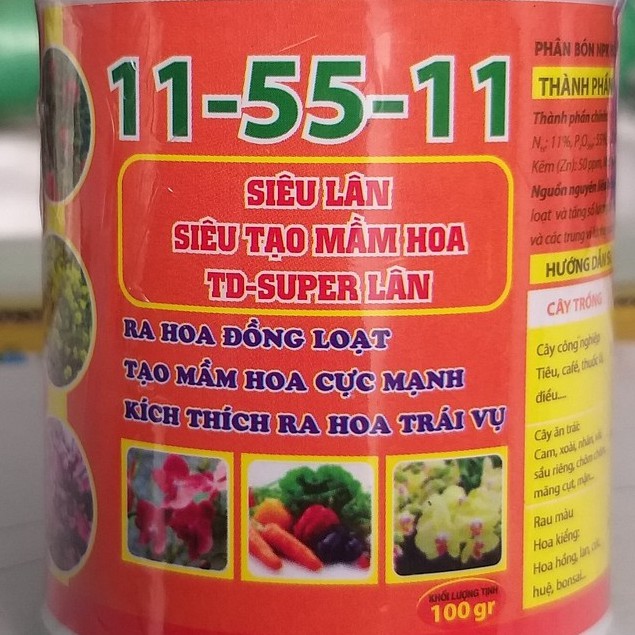 Phân Bón Siêu Lân Bổ Sung Vi Lượng 11-55-11 Siêu Lân, Siêu Tạo Mầm Hoa Cự Mạnh - Phân bón lá siêu ra hoa (100g) + Thành phần chính: Nts: 11%; P2O5hh: 55%; K2O: 11%; Sắt (Fe): 50ppm; Đồng (Cu): 70ppm; Kẽm (Zn): 50ppm; Mangan (Mn): 70ppm; Molipden (Mo): 50ppm; Độ ẩm: