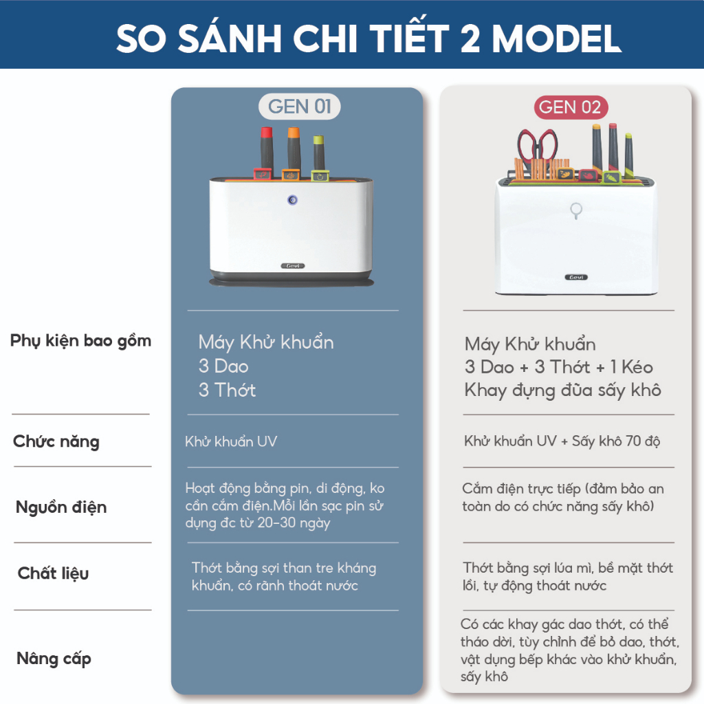 [BỘ PHỤ KIỆN THAY THẾ] Phụ Kiện Thay Thế Bộ Dao Thớt Khử Khuẩn UV Bộ phụ kiện thay thế dành cho khách hàng đã sử dụng bộ Bộ Dao Thớt Kháng Khuẩn UV GEVI Gen 1 và Gen 2. Khách hàng vui lòng kiểm tra đúng model và các bộ phụ kiện mình đang cần sử dụng để chọn phân loại chính xác. Thông tin cụ thể: 1. Bộ Dao Thớt Kháng Khuẩn UV GEVI Gen 1 - COMBO BỘ 3 DAO - COMBO BỘ 3 THỚT - KHOANG MÁY KHỬ KHUẨN 2. Bộ Dao Thớt Kháng Khuẩn UV GEVI Gen 2 - COMBO BỘ 3 DAO + KÉO - COMBO BỘ 3 THỚT - KHOANG MÁY KHỬ KHUẨN * Lưu ý: Dao và thớt của 2 phân loại sẽ có chênh lệch nhau, nên cần chọn đúng phân loại để phụ kiện fit được với khoang khử khuẩn quý khách hàng đang sử dụng.
