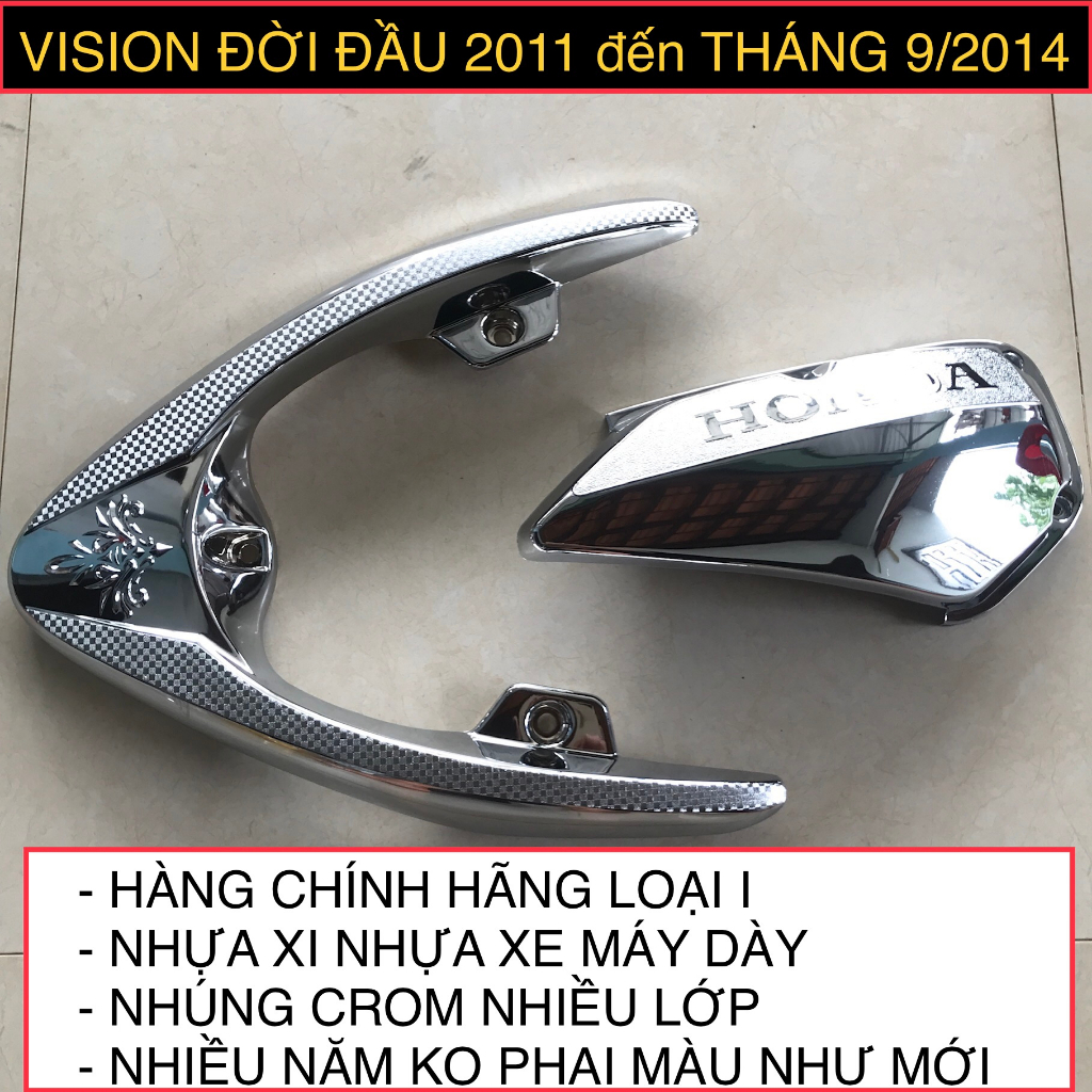 Phụ kiện ốp crom xe VISION đời đầu 2011 đến tháng 9/2014 Không dùng cho vision ra mắt từ tháng 10/2014 đến nay Hàng chính hãng loại I, nhựa xi với độ dày, cứng, bền, được nhúng mạ crom dày nhiều lớp, ko bong tróc crom, không phai màu theo thời gian, sử dụng nhiều năm