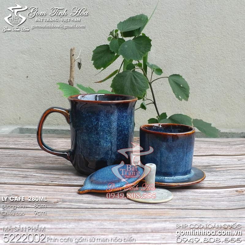 Bộ phin pha cà phê gốm sứ Bát Tràng cao cấp men hỏa biến màu thiên thanh. Phin pha cafe bằng gốm sứ đẹp, chất liệu gốm sứ cao cấp, màu men hỏa biến đẳng cấp và sang trọng. Bộ sản phẩm gồm: 1 phin sứ và 1 ly tách cafe gốm sứ (hoặc 1 ly cốc sứ) cùng chất liệu. (Tùy the