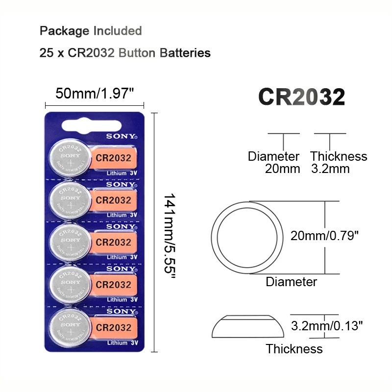 Pin nút thương hiệu Sony - Sử dụng cho nhiều thiết bị như máy tính, đồ chơi, remote, airtag ... - Chất liệu alkaline kiềm - Bền bỉ và tiết kiệm - Size CR2032 - Lưu ý : Quý khách vui lòng xem chính xác size pin của thiết bị trước khi đặt hàng Pin thay thế cho Airtag Tuổi thọ pin lên đến 1 năm Khi hết điện pin không bị chảy nước Điện áp hoạt động ổn định Được apple khuyến cáo sửa dụng cho Airtag Khích thước pin Đường kính 20mm Độ dày 3.2mm Điện áp 3V Sản xuất tại Indonesia TT sản phẩm: Thương hiệu: Sony Xuất xứ: Indonesia Mã sản phẩm: CR2032 Quy cách: Vỉ 1 viên, và 5 viên Mô Tả Sản Phẩm :