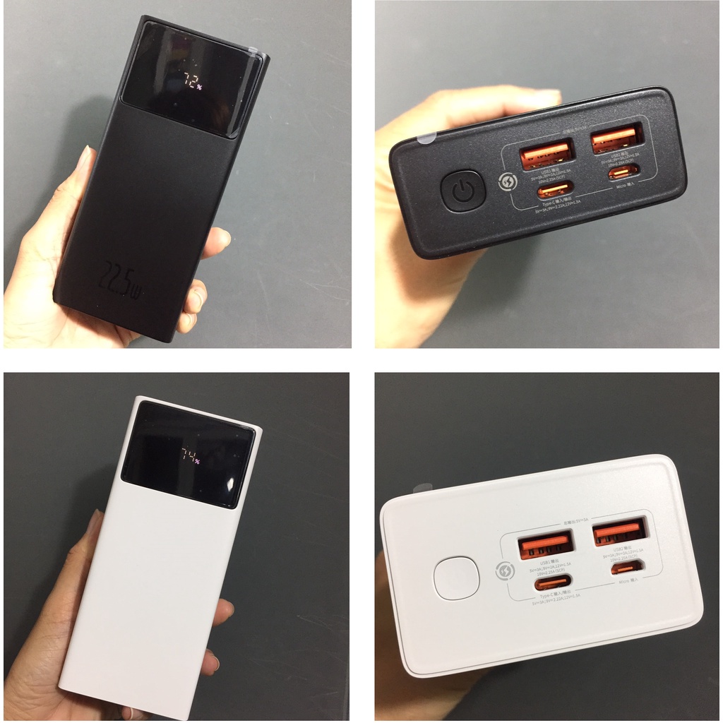 Pin dự phòng 22.5W thương hiệu Baseus Star Lord -Model: PPXJ20 (20.000mAh) ; PPXJ30( 30.000mAh); PPXJ2030 (30W;20.000mAh) -Sản xất tại : Trung Quốc Mô tả: -Dung lượng: 20.000/30.000mAh * 2 Input để sạc lại cho pin: -Micro: 5V-2A ; 9V-2A -Type-C: 5V-3A 9V-2A 3 Output sạc cho các thiết bị khác: (2USB+1Type-C) *Sạc 1 cổng: - C: 5V-3A ; 9V-2.22A ; 12V-1.5A - USB1/USB2: 5V-3A; 9V-2A; 10V-2.25A; 12V-1/5A *Sạc nhiều cổng: 5V-3A -Hỗ trợ PD30W. PD20W,PD18W, 2.4A, SCP 22.5W , FCP 18W, AFC 25W, QC18W..... -Nhiều giao thức bảo vệ, giúp sạc các thiết bị an toàn -Đèn LED báo phần trăm pin -Khối lượng và kích thước (Vui lòng xem trong hình) -Bảo hành: 2 tháng