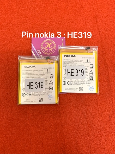 Pin nokia 3 kí hiệu trên pin HE330 và HE319 zin-mới 100% Lưu ý : pin mới mua về các bạn xạc nhồi dùm shop 3 lần 8 tiếng nhé! Cứ báo pin yếu là xạc vô 8 tiếng, trong lúc xạc không chơi game, kg lên mạng, kg xem phim.... nhé! Xạc 3 lần như vậy để pin được đảm bảo dùng