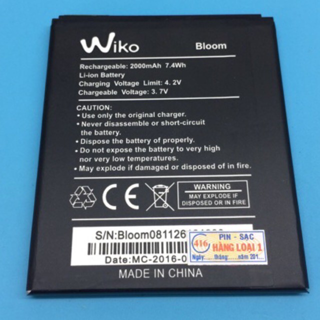 THÔNG SỐ KỸ THUẤT PIN Wiko Bloom Mã máy: Wiko Bloom / RainBow Tình trạng: mới 100% Dung lượng: 2000 mah Điện áp : 3.7 v - 4.2V CÁC DẤU HIỆU NHẬN BIẾT CẦN THAY PIN , có thời lượng sử dụng ngắn hơn so với bình thường. Sạc một lúc pin điện thoại đã trở nên rất nóng,sạc nhanh đầy nhưng sử dụng được 1 lúc đã hết pin *CÁC NGUYÊN NHÂN DẪN ĐẾN HỎNG PIN •Pin điện thoại đã được sử dụng trong thời gian dài, có hiện tượng phồng pin •Do thói quen vừa sử dụng vừa sạc pin •Nguồn điện sạc máy không ổn định •Bạn thường xuyên sạc điện thoại qua đêm