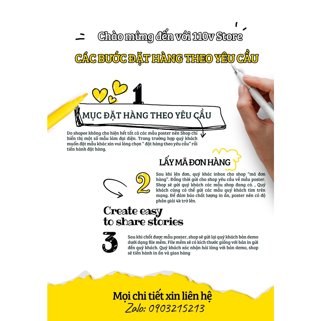 - Poster được in trên giấy Kraft định lượng cao. Chất lượng giấy dầy dặn, chi tiết in sắc nét, không bay mầu. - Khổ giấy A3,A4. - Poster 1 mặt in hình, 1 mặt giấy nhám. Quý khách nên dùng băng dính 2 mặt để dán lên tường. - Trong quá trình vận chuyển, shop sẽ cuộn lại thành dạng ống. Khi nhận hàng Quý khách vui lòng cuốn ngược lại theo chiều của shop để Poster trở lại hình dáng ban đầu. - Để đảm bảo chất lượng vận chuyển là tốt nhất, Quý khách nên đặt số lượng từ 3 tấm trở lên. - Trường hợp Quý khách muốn tham khảo thêm mẫu poster hoặc muốn in theo yêu cầu, vui lòng liên hệ Z@lo: 0903215213 Rất mong nhận được sự ủng hộ của Quý khách. Xin trân trọng cảm ơn !!!