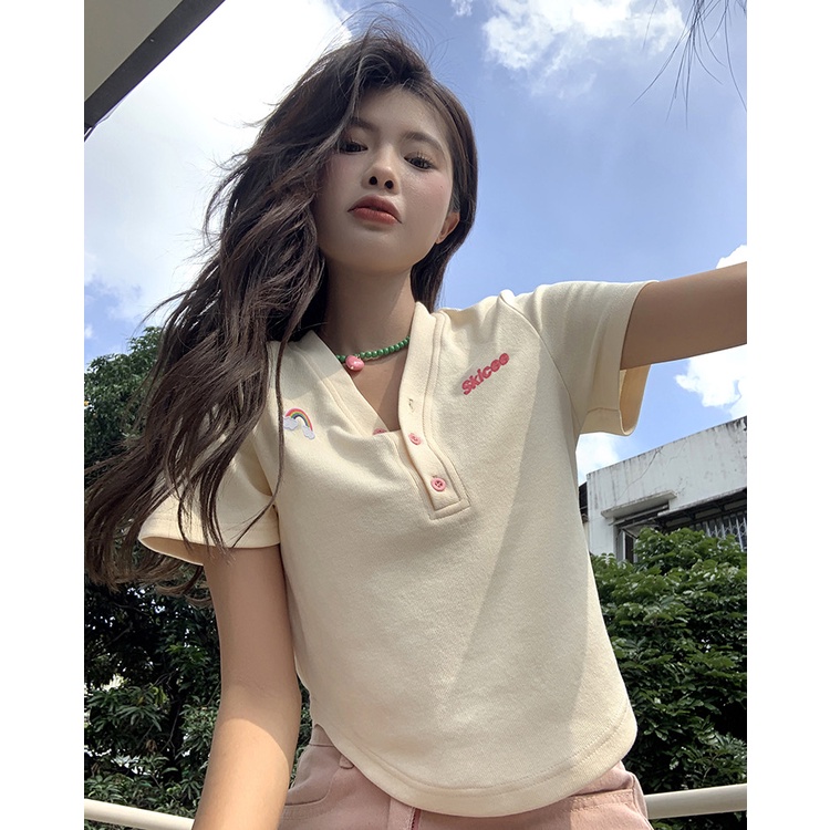 QOEDDV Áo Thun Ngắn Tay Dáng Rộng Cổ Chữ V Thoáng Khí Thời Trang Mùa Hè Cho Nữ
