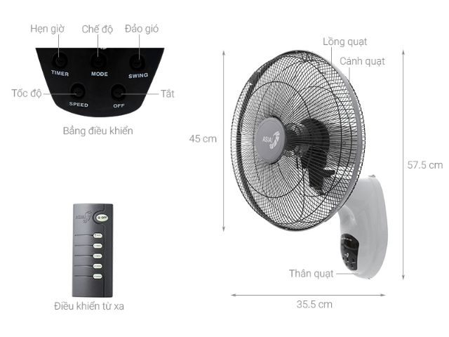 Đặc tính sản phẩm Loại quạt:Quạt treo tường Công suất:55 W Chức năng:Làm mát Đường kính cánh quạt:40 cm Số cánh quạt:3 cánh Tốc độ gió:3 mức gió Chế độ gió:Gió thường Bảng điều khiển:Nút nhấn, Remote Loại motor:Bạc thau Tiện ích:Điều khiển từ xa, Hẹn giờ tắt Trọng lượng:3.5 kg Kích thước:Ngang 43.5 cm - Cao 57.5 cm - Sâu 35.5 cm Thương hiệu của:Việt Nam Sản xuất tại:Việt Nam Hãng:Asia.