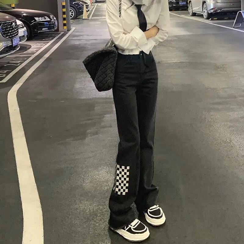 Quần Bò Ống Loe Lưng Cao Phối Caro Độc Đáo Phong Cách Retro