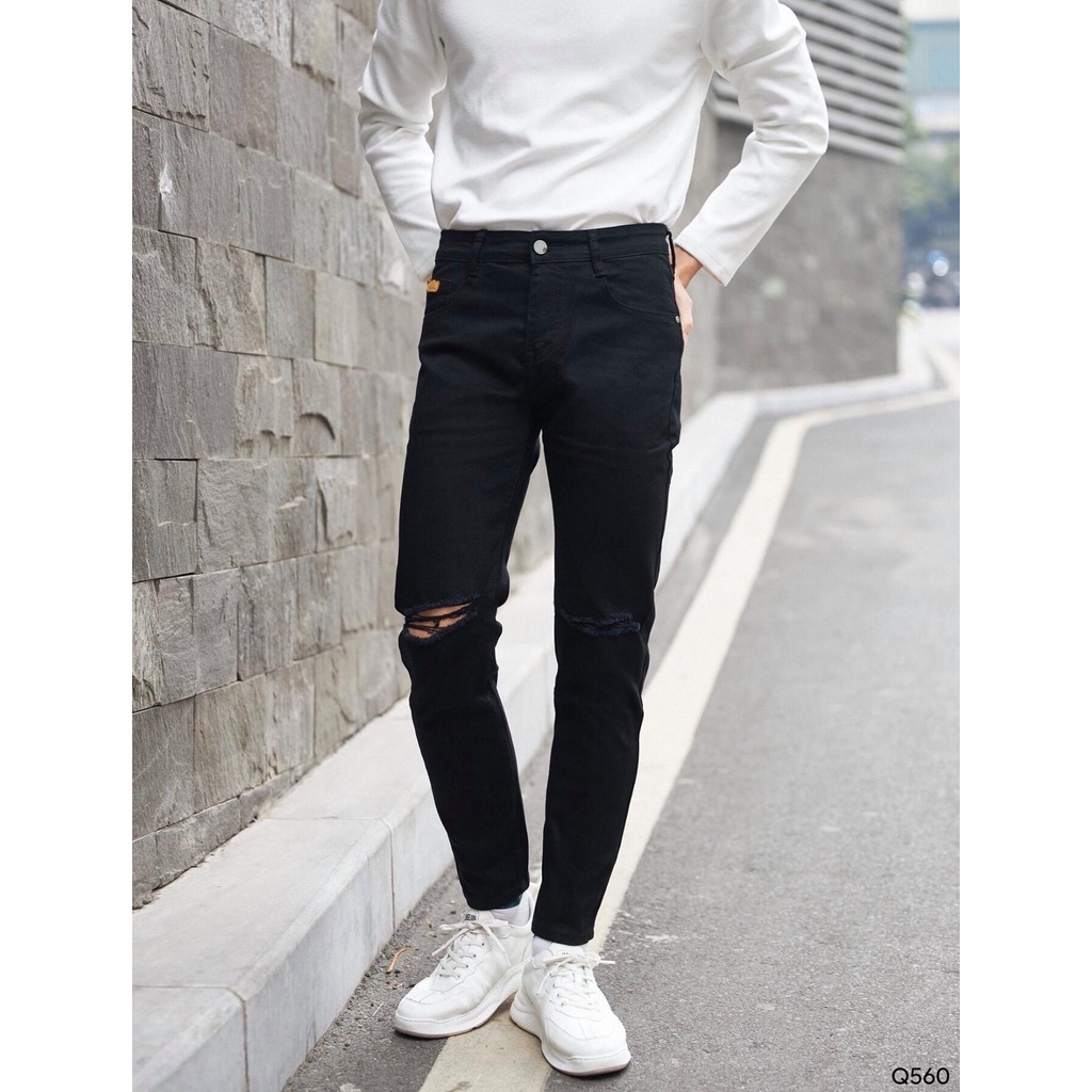 Quần Jean Dài Nam Rách Gối Màu Đen Chất Bò Cao Cấp Co Dãn 4 Chiều Cực Đẹp , From Dáng Skinny mẫu 99861 Siêu Đẹp