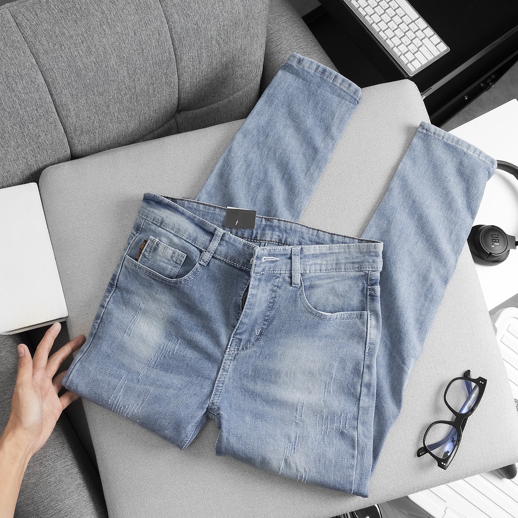 Quần Jean Nam Màu Xanh Xước Nhẹ Thiết Kế Trẻ Trung, Quần Jean Nam Hàn Quốc Cá Tính, Quần Bò Nam Chất Vải Denim Co Dãn