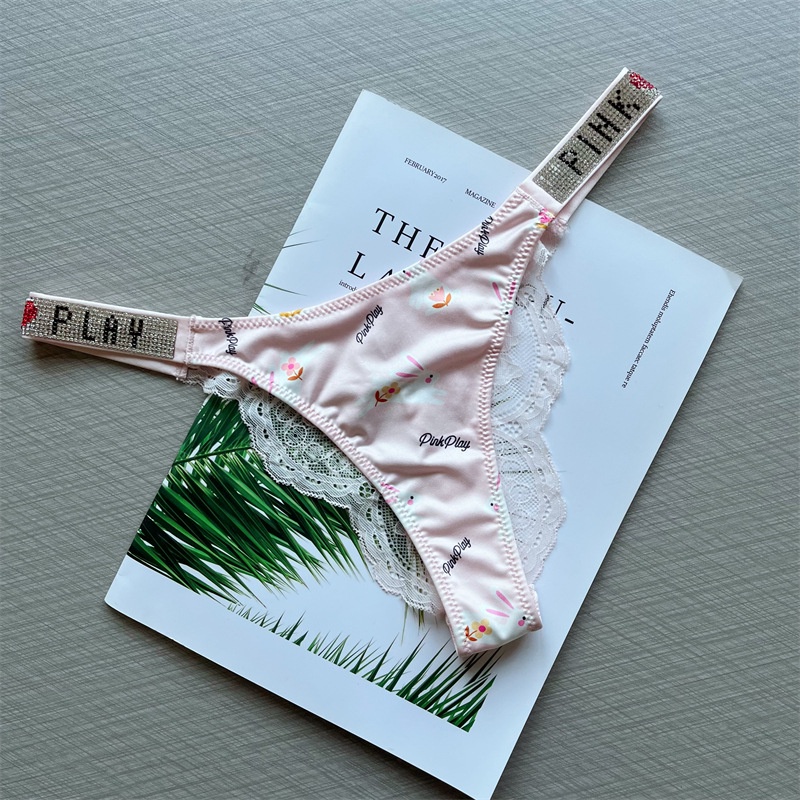 QUẦN LÓT LỤA SỮA, REN NỬA MÔNG XUYÊN THẤU, ĐÍNH ĐÁ CHỮ PINK PLAY CAO CẤP