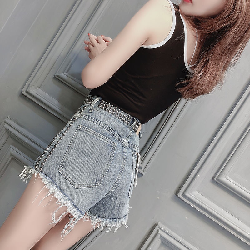 Quần Short Denim Lưng Cao Dáng Rộng Viền Rách Đính Hạt Phong Cách Hàn Quốc Mới Cho Nữ
