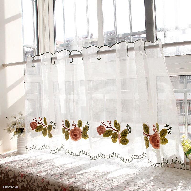 Rèm ngắn vải cotton pha thêu họa tiết trang trí nhà bếp quán cà phê
