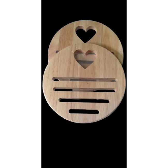Kích thước: D20 x 1.5 cm Rế lót nồi, đế để nồi hình trái tim bằng gỗ được làm từ gỗ cao su, có bề mặt nhẵn mịn, khả năng chịu nhiệt và chịu lực tốt và có độ bền cao. Sản phẩm được thiết kế có các rãnh để tạo sự ma sát giúp các đồ dùng không bị trơn tuột nhằm đảm bảo t