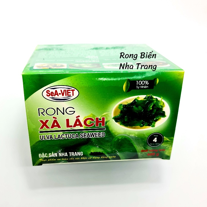 Rong biển xà lách - Hộp 600g gồm 4 gói mỗi gói 150g _ Sản phẩm của Công Ty TNHH Thực Phẩm Sea Việt (Thành phố Nha Trang, tỉnh Khánh Hòa). _ Thành phần: rong biển xà lách (90%), muối ăn (10%). _ Hướng dẫn sử dụng: + Rửa rong biển cho trôi nước muối và ngâm rong biển trong nước sạch khoảng 1 - 3 phút cho rong biển hết muối mặn. Sau đó vớt ra để ráo, rồi chế biến các món ăn. + Dùng để nấu canh, làm món trộn salad, chiên xào, nấu cháo, và các món ăn khác ... _ Bảo quản: + Nơi khô ráo, thoáng mát, tránh ánh nắng mặt trời. + Tốt nhất có thể để trong ngăn mát tủ lạnh. _ Xuất xứ: Việt Nam (Thành phố Nha Trang, tỉnh Khánh Hòa). _ Hạn dùng: 12 tháng kể từ ngày sản xuất.