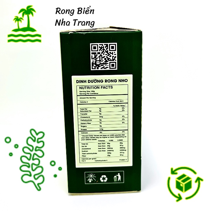 Rong nho tách nước Okinawa hộp 240g (12 gói x 20g) Sản phẩm của Công Ty TNHH SX - TM - XNK D & T đặt tại thành phố Biển Nha Trang, Khánh Hòa. Thành phần: 90% rong nho tách nước, 10% nước muối bảo hòa. + Cách sử dụng: 1. Ngâm rong nho vào tô nước sạch khoảng 3 phút rong sẽ nở ra và tươi trở lại (đổ nhiều nước để rong giảm độ mặn nhanh, có thể thay nước trong quá trình ngâm). 2. Vớt rong ra cho tiếp vào tô nước đá để rong lạnh và giòn, rồi dùng ngay vì sau 30 phút rong sẽ mềm trở lại. 3. Dùng trực tiếp như rau sống với các loại nước chấm tùy thích (xì dầu, muối ớt xanh, sốt mayonise,...) Hoặc ăn kèm với các món ăn đã chế biến sẵn. Dùng để ăn sushi. * Lưu ý: không chiên, xào, nấu chín, đổ nước xốt trực tiếp lên rong nho vì rong nho sẽ teo lại. LÀM ĐẸP DA: dùng khoảng 3 cọng rong nho tươi (sau khi ngâm nước), giã nhuyễn, rồi thoa lên mặt. Còn xác thì đắp lên mắt. Để qua đêm vẫn được. Thoa lên da bị viêm do nắng nóng, khói bụi sẽ giúp da trở lại bình thường sau khoảng 2 đến 3 ngày sẽ hết. Quý khách khỏi cần pha thêm sữa tươi này nọ. Tác dụng phụ: vẫn chưa tìm thấy. Quý chị em đi làm, đi học khỏi đánh phấn thoa kem da vẫn TRẮNG, CHẮC, KHỎE & ĐẸP RỰC RỠ. + Rong nho có mùi vị đặc trưng tự nhiên của biển. + Bảo quản nơi khô ráo, thoáng mát, tránh ánh nắng trực tiếp. + Xuất xứ: Việt Nam. + Hạn sử dụng: 6 tháng kể từ ngày sản xuất và 12 tháng trong ngăn mát tủ lạnh.