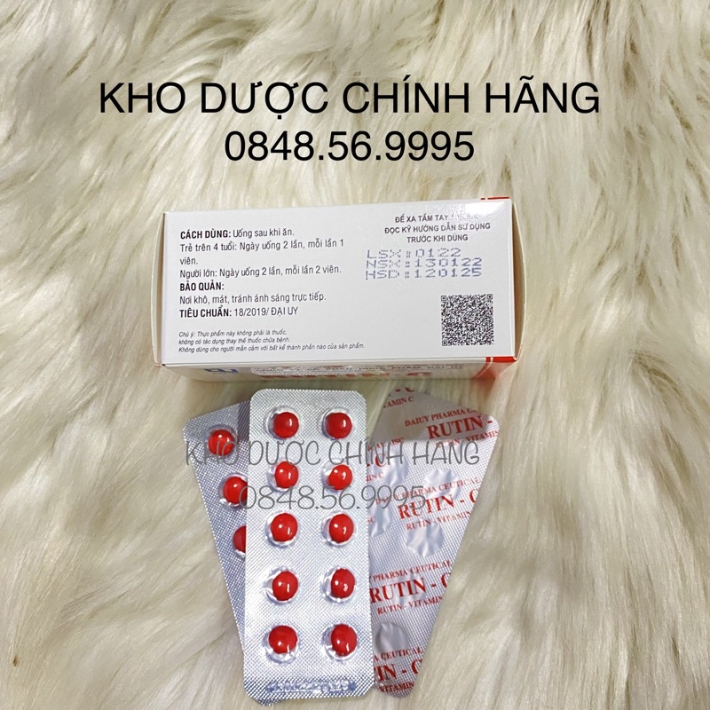 - Thành phần: Rutin 10.5mg, vitamin C 10mg, phụ liệu vừa đủ 1 viên - Công dụng: Bổ sung Vitamin C và Rutin giúp tăng tính bền thành mạch máu, hỗ trợ tăng cường sức đề kháng, giảm xuất huyết dưới da, chảy máu chân răng do thiếu vitamin C - Đối tượng sử dụng: Dùng cho