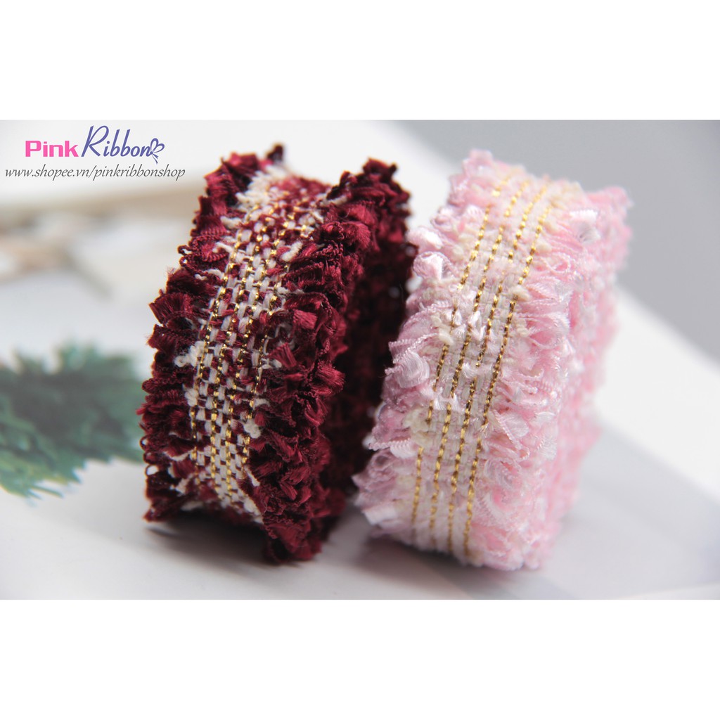 Ruy băng chất liệu da tweet cao cấp, hai viền tua rua đẹp mắt. Chất liệu cao cấp, phù hợp sử dụng trong ngành may mặc, phụ kiện thời trang, phụ kiện tóc, quà tặng. Kích thước: 3cm-2.2cm-1.5cm Màu sắc: 09 màu Giá: * Cỡ 3cm: 8.000/mét * Cỡ 2.2cm: 7.500/mét * Cỡ