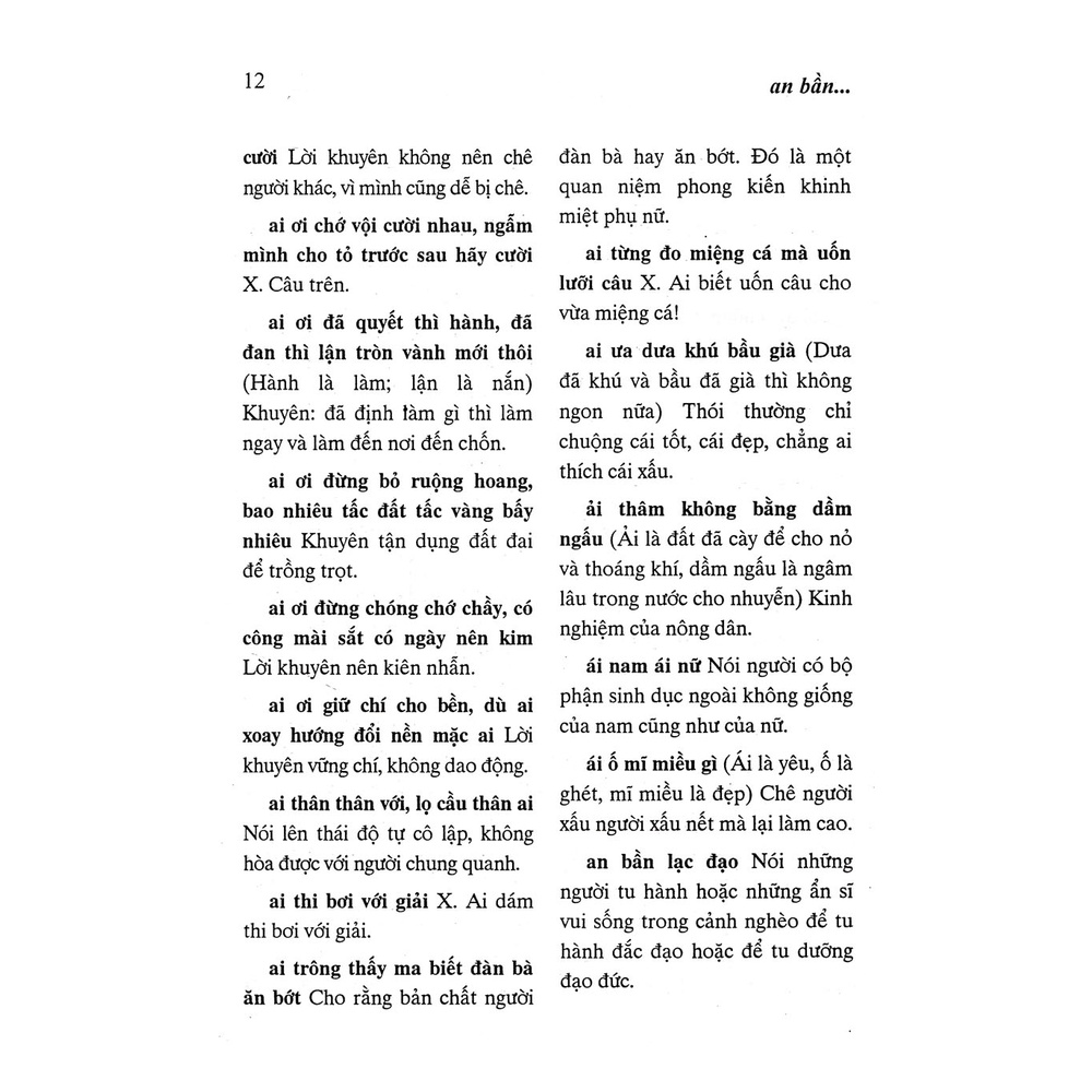 Từ Điển Thành Ngữ Và Tục Ngữ Việt Nam Hiểu và vận dụng linh hoạt thành ngữ, tục ngữ và các tình huống cụ thể sẽ giúp chúng ta biết nói đúng và viết đúng, để có thể tiến tới nói hay và viết hay. Sự ra đời của cuốn từ điển này không nằm ngoài mục đích đó. Cuốn sách này sẽ giúp các bạn học sinh, sinh viên nắm vững hơn nội dung cụ thể của từng thành ngữ, tục ngữ; để trên cơ sở đó, vừa bổ sung kiến thức, vừa vận dụng vào cách nói, cách viết của mình được trong sáng hơn, hiệu quả hơn. Tác giả: GS.Nguyễn Lân NXB: NXB Văn Học Phát hành: Minh Thắng Năm xuất bản: 2014 Dạng bìa: Cứng Số trang: 632 trang