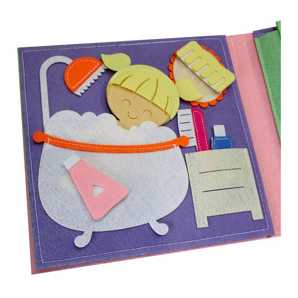 Sách vải Một Ngày Của Bé Gái – Dành cho bé gái từ 1 – 10 tuổi| Sách vải Xuất Khẩu Khasa giúp các bé hoàn thiện khả năng điều khiển bàn tay và các ngón tay với những hoạt động luồn dây, bấm khuy, cài cúc, xỏ dây, bấm cúc, bóc dán,… Kích thước 20x20cm, nền vải dạ eco an