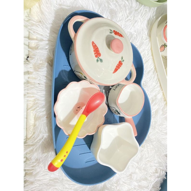 sét bao gồm bát sứ dung tích 350ml và 120ml tùy mẫu, combo tặng kèm khay mây và thìa báo nóng, shop có hỗ trợ đổi màu khay