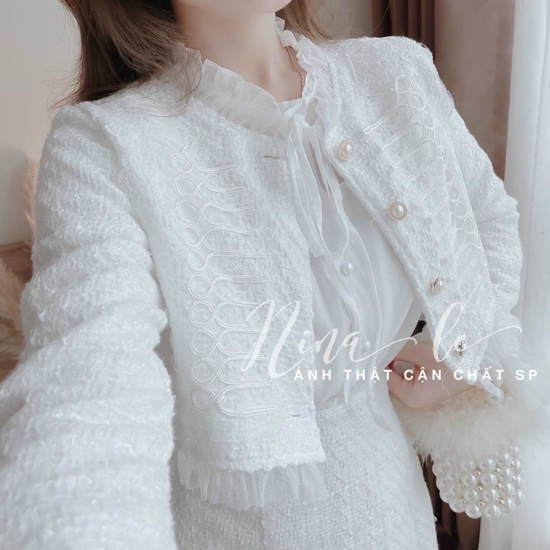Sét chân váy dạ áo sơ mi và áo khoác dạ viền ren