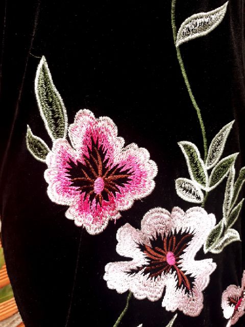 Sườn xám nhung thêu Size L Vai 35 Ngực 92-94 Eo 80-82 Mông 94-96 Dài 90 Chất liệu nhung có độ co giãn nhẹ Xẻ tà 2 bên Họa tiết thêu trực tiếp