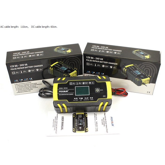 Sạc bình ắc quy 12V 24V 8A Foxsur cho ô tô xe máy các loại bình khô và nước chống chai phù bình có khử sunfat