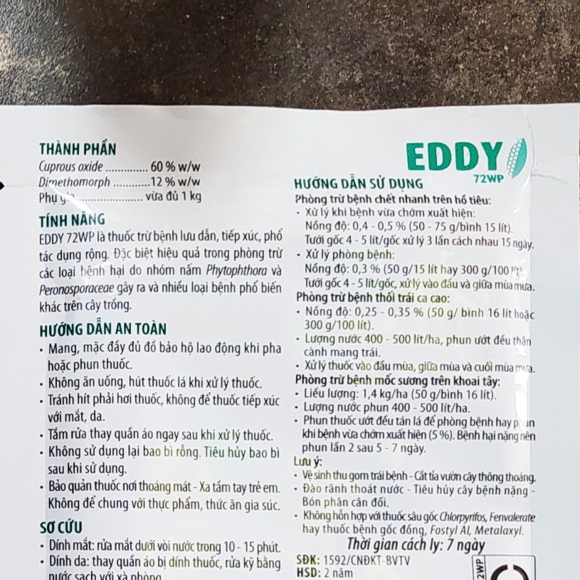 Sản Phẩm Chuyên Trị Vàng Lá Thối Rễ Super Acid Humic + EDDY 72WP, giải pháp bảo vệ cây trồng Bệnh vàng lá thối rễ là một trong những bệnh có khả năng lây lan rộng và tái phát hằng năm nếu không được xử lý triệt để. Cắt tỉa cành vàng - Việc cắt tỉa bớt các cành bị vàng nhằm mục đích giảm áp lực lên rễ, giảm sự thoát hơi nước, bởi trong tình trạng này rễ không thể hấp thụ được nước và dinh dưỡng nuôi cả cây. - Nấm phytophthora là tác nhân chính gây bệnh vàng lá thối rễ. Để cây trồng có thể phục hồi, cần phải diệt sạch những chủng nấm gây bệnh này trước khi chúng phát tán, lây ra ra toàn cây, toàn vườn. - Sau khi đã tiêu diệt được toàn bộ nấm bệnh gây hại trong đất, tiến hành kích rễ cho cây. Giúp cây hút được nước, hút dinh dưỡng từ đó ra đọt non mới… Super Humic giúp cây ra rễ non, cây hấp thu dinh dưỡng tốt, cải tạo đất EDDY 72WP đặc trị nấm Phytophthora cho bộ rễ Liều lượng dùng: Pha 50gram humic + 50g EDDY với 20 lít nước. tưới ướt vùng rễ quanh gốc từ 7 - 10 ngày/lần. tưới khoảng 3 lần. sau đó tiếp tục tưới humic cho cây phục hồi và phát triển trở lại