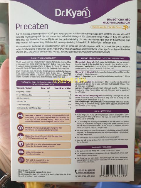 Sữa bột dinh dưỡng cho mèo Dr.Kyan Precaten 110g Sản xuất tại nhà máy của Dr.Kyan (tại Hà Nội) •Nguồn nguyên liệu : Sữa bột nhập khẩu từ New Zealand •Sữa bột dành cho chó mèo PREDOGEN/PRECATEN được sản xuất theo công thức của WONDERLIFE PHARMA (Hoa Kỳ) là một thực phẩm bổ dưỡng cho chó yêu của bạn ngoài những thức ăn thông thường, giúp chó yêu cảm thấy ngon miệng hơn, bồi bổ cơ thể và cung cấp những thứ cần thiết để phát triển toàn diện. •- Cung cấp vitamin A tốt cho mắt và ngăn biến chứng võng mạc, giúp cho da khỏe mạnh và có một bộ lông bóng mượt. - Bổ xung canxi Nano và vitamin D, - Với một lượng canxi và vitamin D dồi dào hấp thu tối ưu nhất vào xương, giúp xương và răng chắc khỏe, đặc biệt không tạo ra sỏi thận như thức ăn thông thường. - Canxi nano và vitamin D : Kích thước siêu nhỏ giú hấp thụ tối ưu vào xương, giúp xương và rang chắc khỏe, đặc biệt không tạo ra sỏi thận như thức ăn thông thường. - Vitamin A : Tốt cho mắt và ngăn biến chứng võng mạc. - Biotine : Giúp cho da khỏe mạnh và bộ lông bóng mượt. - Lnulin :chất xơ tự nhiên giúp hệ tiêu hóa khỏe mạnh. - Lysine : Kích thích thèm ăn - Folic acid : Hỗ trợ phát triển trí não. •Thành Phần: Sữa bột nguyên kem, Sữa bột gầy,Nondairy creamer, Maltodextrin,Sucrose,Whey protein concentrate,Hương dùng trong thực phẩm,Chất xơ Inulin, Lysine, Nano - Precipitated Calcium Carbonate,Vitamin C, Vitamin K1, Vitamin B6, Vitamin B1, VitaminB2, Vitamin D3, Vitamin A, Vitamin B12, Vitamin Axit Pantothenic, Biotine, Axit Folic... •Thành phần dinh dưỡng trong 100gr sữa bột : - Năng lượng / Energy : 440gr. - Độ ẩm/Moisture: 5gr. - Chất đạm/ Protein : 15gr. - Chất béo/ fat : 18,9gr. - Xơ thô/ Fiber : 0,05gr. - Khoáng chất/ Mineral: 5gr.