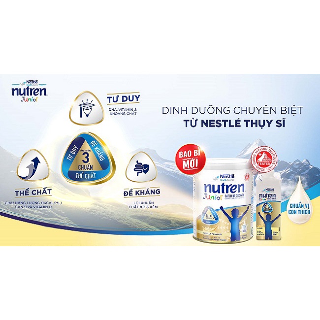 “Sữa mẹ là thức ăn tốt nhất cho sức khỏe và sự phát triển toàn diện của trẻ sơ sinh và trẻ nhỏ” Sản Phẩm Dinh Dưỡng Nestle Nutren Junior (800g) là công thức dinh dưỡng cao năng lượng đến từ Nestlé Thụy Sĩ với đạm Whey chất lượng cùng Synbiotics (Probiotics và Prebiotics) dành cho trẻ có nhu cầu năng lượng cao, trẻ kém hấp thu, trẻ gặp vấn đề về ăn uống, trẻ bị bệnh đang trong quá trình hồi phục sức khỏe, trẻ bị suy dinh dưỡng hoặc có nguy cơ suy dinh dưỡng. Sản Phẩm Dinh Dưỡng Nestle Nutren Junior (800g) Thông tin dinh dưỡng Với công thức đến từ Nestlé Thụy Sĩ, Nutren Junior cung cấp: - Năng lượng cao (1 kcal / ml) giúp trẻ ăn uống kém bắt kịp đà tăng trưởng. - Đạm Whey chất lượng giúp trẻ hấp thu dễ dàng. - Hỗn hợp Probiotics (vi sinh vật có lợi) và Prebiotics (chất xơ) giúp duy trì sự cân bằng hệ vi khuẩn đường ruột, tăng cường hệ miễn dịch. - Giàu DHA giúp phát triển trí não và thị giác. - Cung cấp đầy đủ vitamin và khoáng chất cần thiết hàng ngày Hướng dẫn sử dụng và bảo quản Chỉ sử dụng sản phẩm trong vòng 1 tháng từ khi mở hộp Sau khi pha nên sử dụng sản phẩm trong vòng 6 tiếng nếu bảo quản trong nhiệt độ phòng hoặc 12 tiếng nếu bảo quản trong tủ lạnh Bảo quản nơi khô thoáng Sản phẩm có thể bị vón cục trong quá trình vận chuyển, điều này là bình thường không ảnh hưởng đến chất lượng sản phẩm Không dùng cho trẻ dưới 1 tuổi --------------- Ruby Mart - 182 Lê Văn Sỹ 0919906135